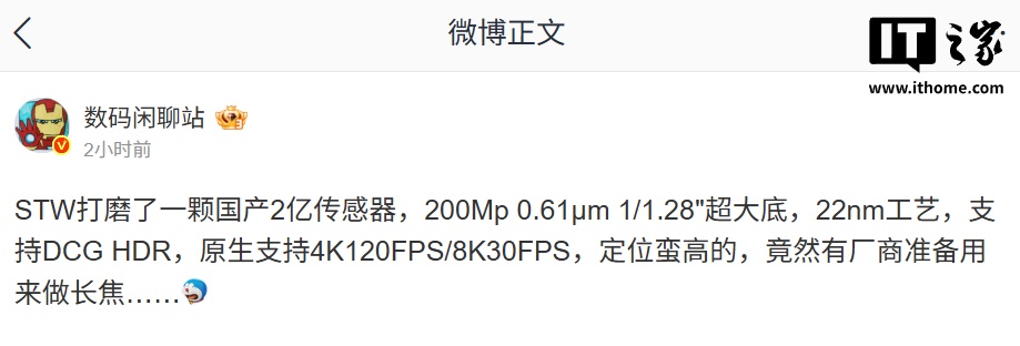 IT之家 7 月 17 日消息,博主 @数码闲聊站 今日于微博发文,曝光了思特威尚未发布的 2 亿像素 CMOS,这款 CMOS 尺寸为 1/1.28 英寸,定位“蛮高的”。这款 CMOS 像素数为 ...